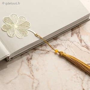 Faites une belle surprise à un proche qui aime la lecture en lui offrant ce charmant marque-pages représentant un joli trèfle à 4 feuilles doré. Il est doté d'un pompon avec une perle jaune. Une merveille qui ornera ses bouquins.