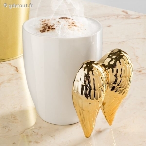 C'est un accessoire unique en son genre qui dispose d'une poignée représentant des ailes d'ange. Le mug est blanc et les ailes sont dorées.
