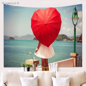 Voilà une magnifique tapisserie qui apportera une note sublime et estivale à votre intérieur ! Elle affiche une femme tenant un parapluie rouge original en forme de cœur, vue de dos et qui fait face à la mer.