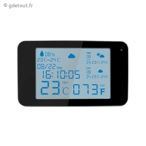 Trouvant sa place dans votre maison ou dans votre bureau, cette horlogeest votre allié pour savoir le temps qu'il fait, le taux d'humidité, la température, l'heure et la date.